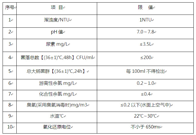 游泳池池水水質(zhì)常規(guī)檢驗項目及限值: