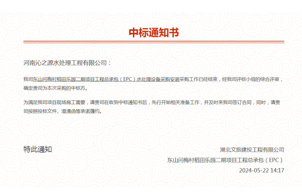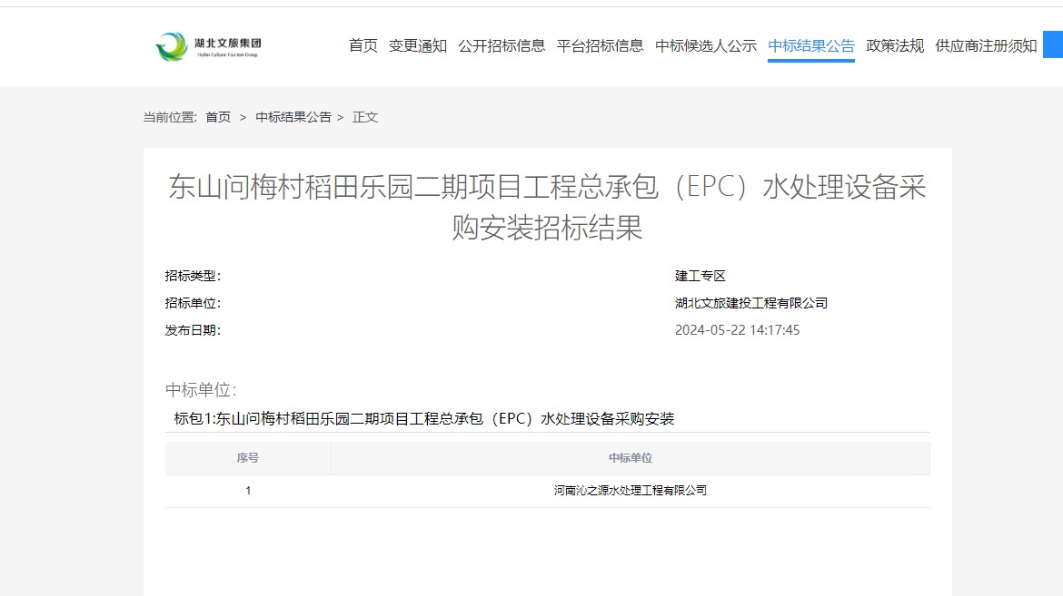 熱烈祝賀我司中標湖北文旅東山問梅村稻田樂園二期項目工程總承包(EPC)水處理設備采購安裝項目。我司將積極配合項目進展以高標準、高品質完成設備安裝工作。