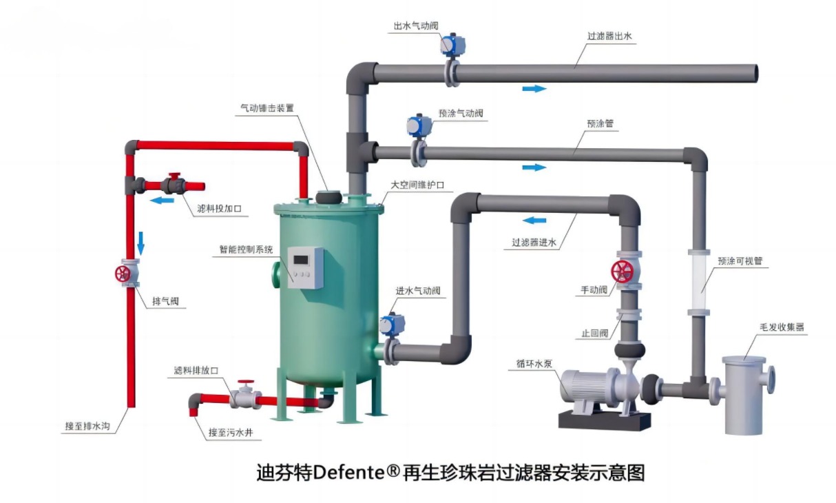 砂缸通過砂床截留過濾池水中的顆粒物。當砂床變臟/負荷增大時,必須進行反沖洗過程,恢復設(shè)計循環(huán)流量,在反沖洗過程中大量的水被排放掉,這是一筆極大的運行費用。再生介質(zhì)過濾器在涂有珍珠巖介質(zhì)的軟管表面捕集顆粒。當珍珠巖濾料截留的顆粒物增加到一定程度時,再生介質(zhì)過濾器通過“撞擊”將濾料從濾管表面脫落,然后自動進入預涂過程,將濾料重新附著在過濾管的表面進行正常的過濾循環(huán)過程。如此往復多次,直到缸體內(nèi)濾料的吸附能力完全耗盡,將濾料排放出缸體,重新放入新的濾料。使用過程完全沒有反沖洗的過程,節(jié)省了大量的用水!