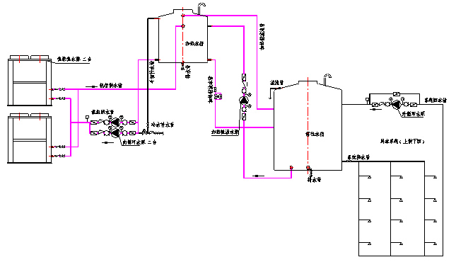 3、系統(tǒng)恒溫階段:當(dāng)蓄熱水箱內(nèi)的55℃熱水長(zhǎng)時(shí)間不使用,或者系統(tǒng)回水進(jìn)入蓄熱水箱混合后水溫降低到50℃(可以自行設(shè)定)時(shí),恒溫循環(huán)水泵啟動(dòng),把蓄熱水箱的50℃水抽到加熱箱,同時(shí)加熱箱里的55℃水從溢流管溢流到蓄熱箱水箱里,加熱循環(huán)水泵啟動(dòng),然后熱泵機(jī)組啟動(dòng),對(duì)加熱水箱內(nèi)的水進(jìn)行加熱,直到加熱水箱內(nèi)的水溫上升到55℃時(shí),熱泵機(jī)組停止運(yùn)行,然后加熱循環(huán)水泵、恒溫水泵停止運(yùn)行。