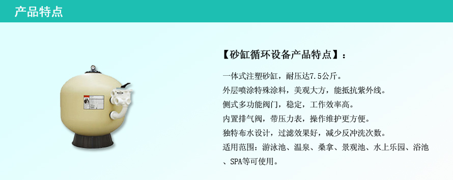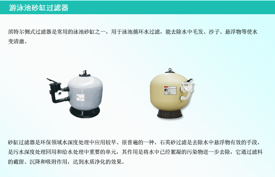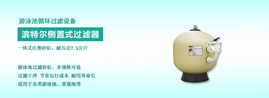 ??? 濱特爾頂側(cè)式過濾器是常用的泳池砂缸之一,用于泳池循環(huán)水過濾,能去除水中毛發(fā)、沙子、懸浮物等使水變清澈。